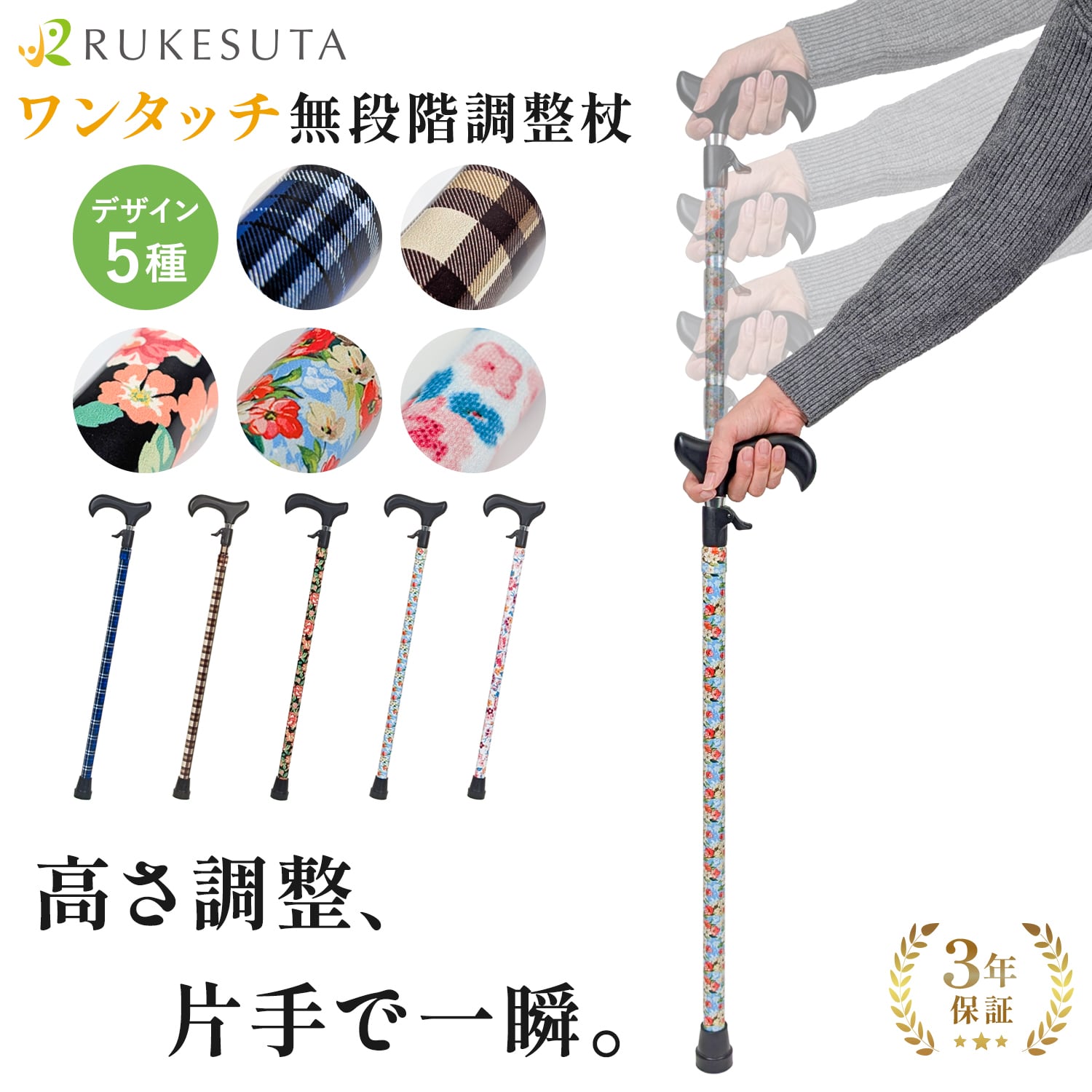 [介護の専門家監修] 杖 男性 おしゃれ 女性 おしゃれな かっこいい ステッキ 無段階伸長 ワンタッチ操作 おじいちゃん おばあちゃん 高齢者 敬老の日 父の日 母の日 プレゼント 花柄 チェック柄 滑りにくい安心設計 無段階調整 RUKESUTA 歩行サポート 介護