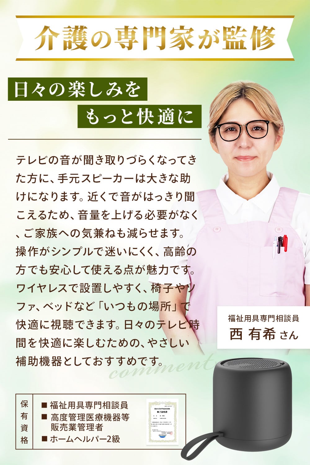 ![[介護の専門家監修] 手元スピーカー 高齢者 テレビ用 ワイヤレス 無線 コードレス 充電式 簡単接続 大音量 クリア音質 低遅延 テレビスピーカー 高齢 シニア 聞き取りサポート リビング キッチン ベッドサイド 置くだけ 簡単 コンパクト 持ち運び RUKESUTA](https://baseec-img-mng.akamaized.net/images/item/origin/5c5d1ebec892873288a4c56580307864.jpg?imformat=generic)