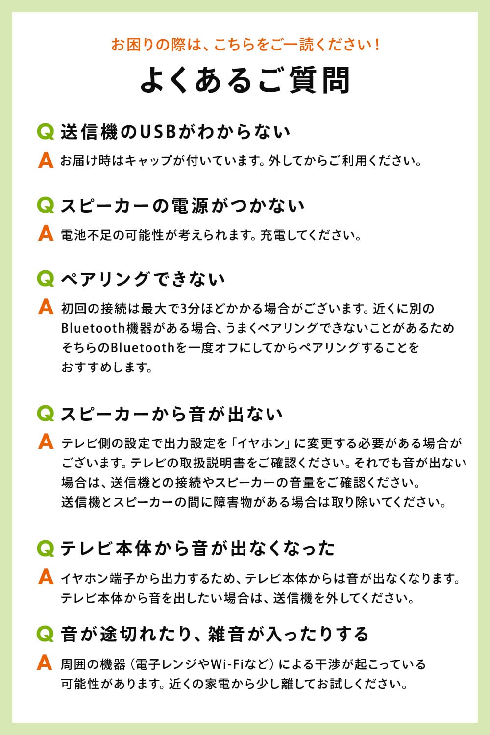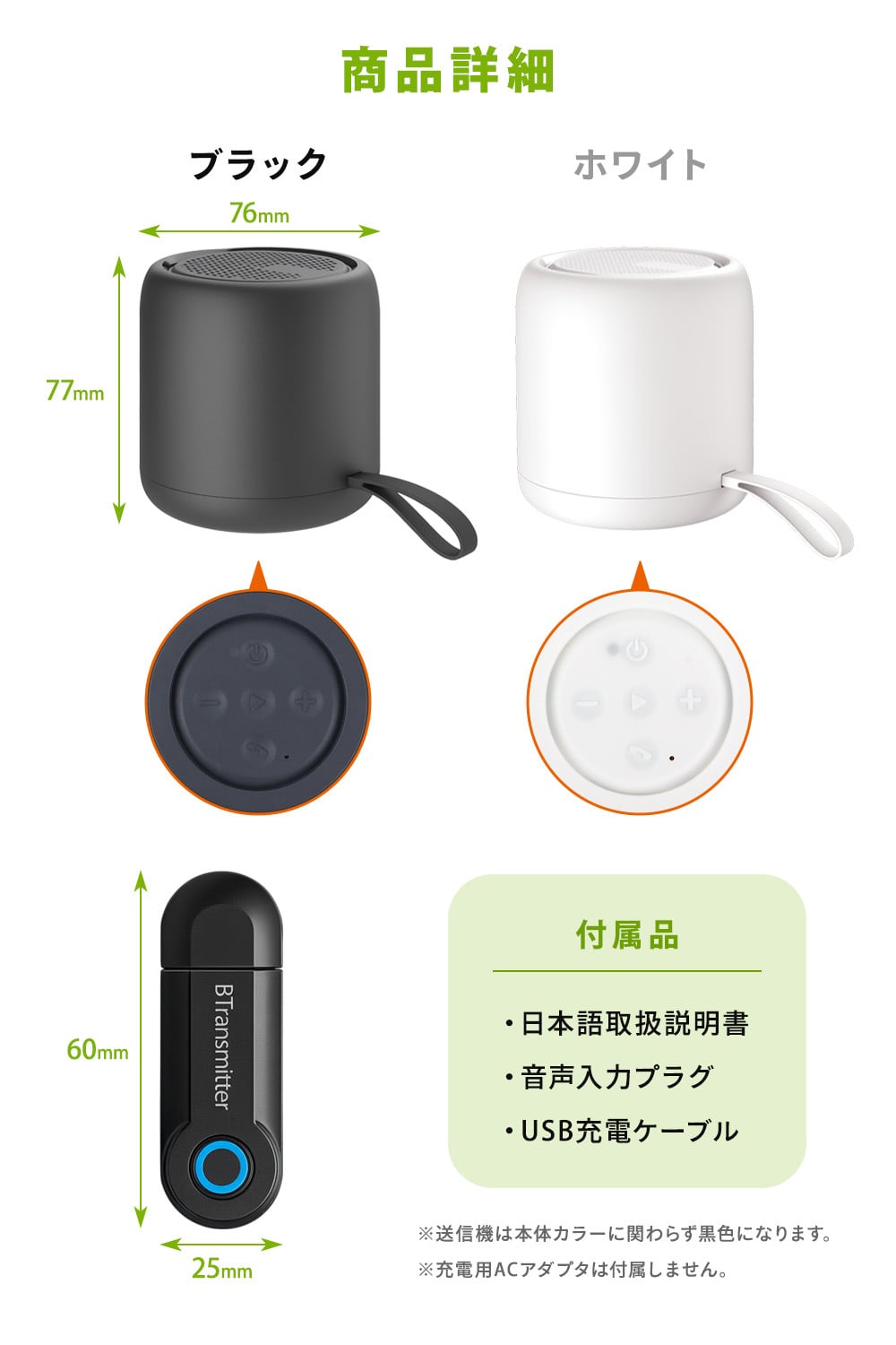 商品内容 スピーカー、送信機、音声入力プラグ、USB充電ケーブル、日本語説明書